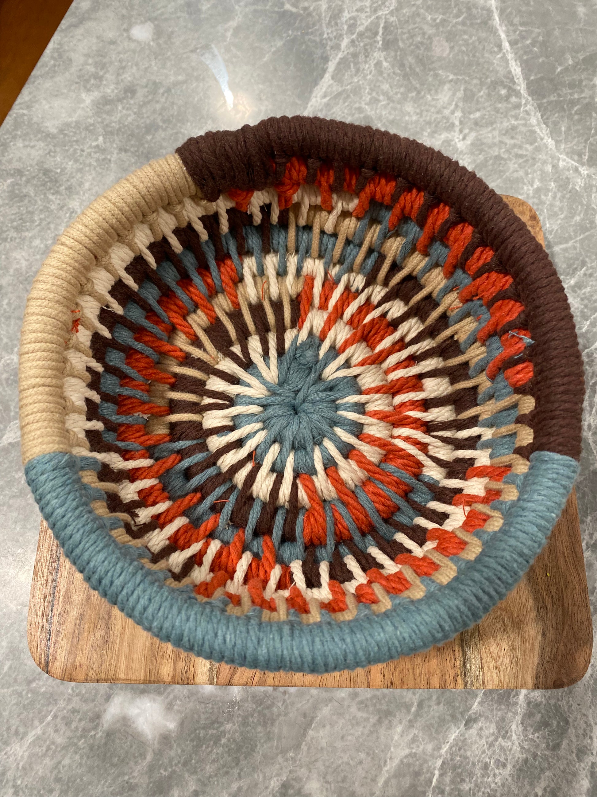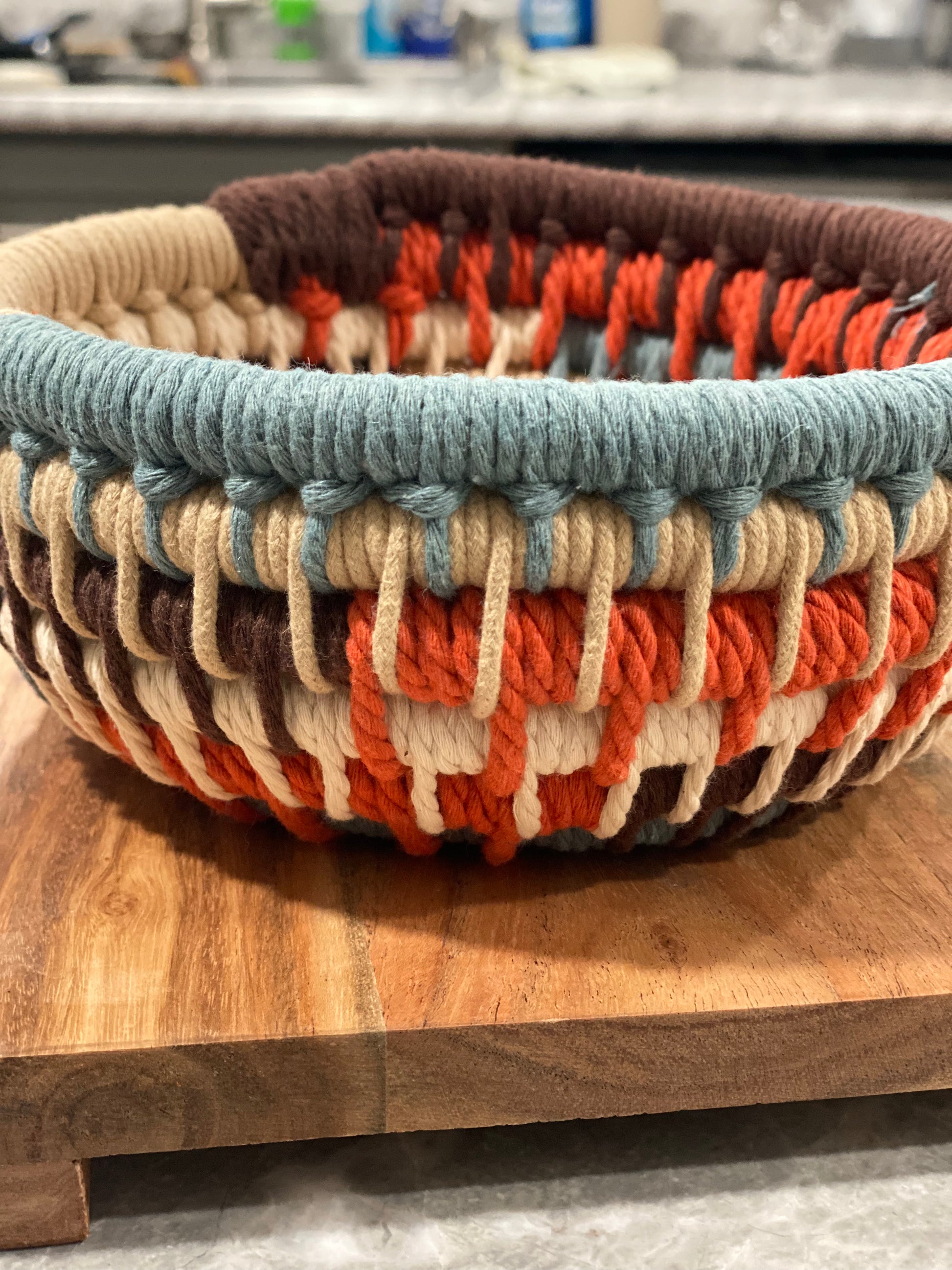 Baskets are handmade, crafted from all American products of all natural cotton macrame cord and cotton sash cord. Cleaning care: wipe with damp cloth or warm soapy water. Custom orders available, contact us for details.
